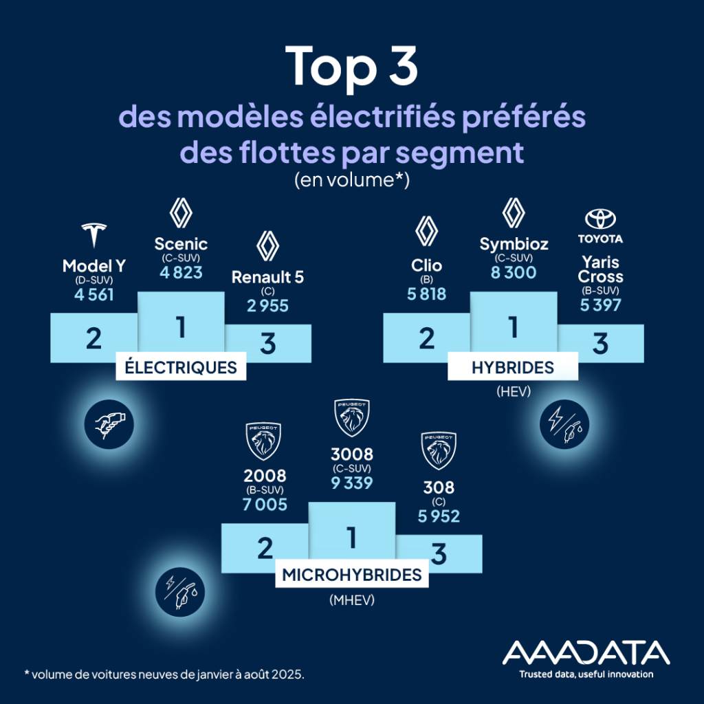 Parmi les immatriculations de voitures neuves électrifiées des flottes sur les huit premiers mois de l’année, les motorisations 100 % électriques, hybrides classiques (HEV) et microhybrides (MHEV) se répartissent à niveau presque égal, chacune à 21 % de part de marché, loin devant toutes les autres. Et pour toutes les trois, le modèle qui se place en tête est un SUV du segment C. En électrique, il s’agit du Renault Scenic (4 823 unités), suivi du Tesla Model Y (D-SUV, 4 561 unités), seul modèle de marque étrangère présent dans ce classement, et de la Renault 5 (berline du segment B, 2 955 unités). En hybride, Renault prend encore la première place avec le Symbioz (8 300 unités), suivi de la Clio (berline du segment B, 5 818 unités) et du B-SUV Toyota Yaris Cross (5 397 unités). Peugeot monopolise le podium microhybride avec le 3008 (9 339 unités), devant le B-SUV 2008 (7 005 unités) et la berline compacte 308 (5 952 unités).