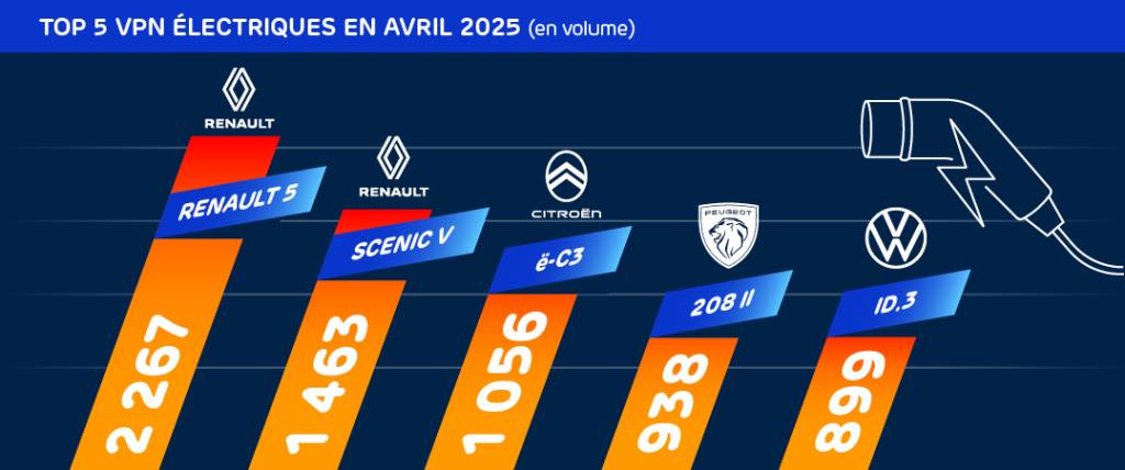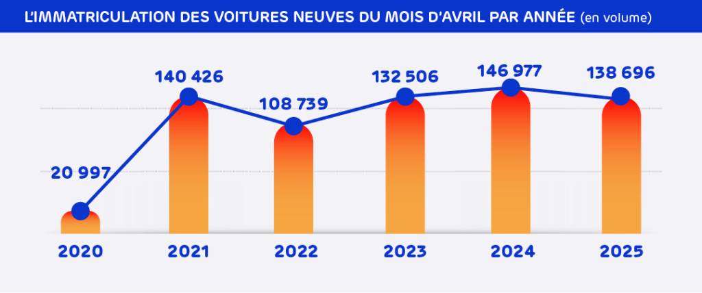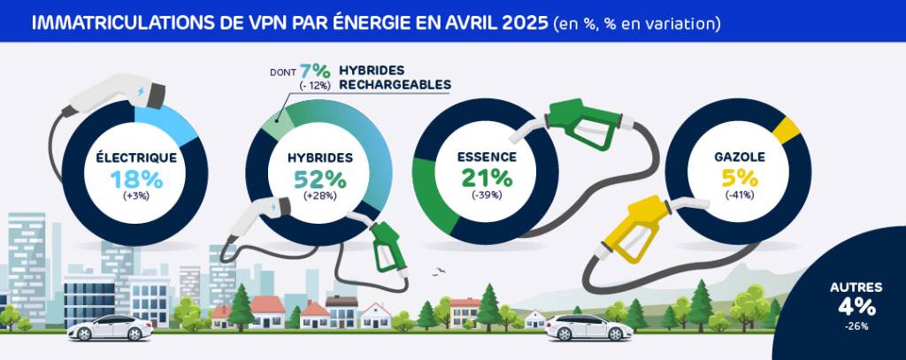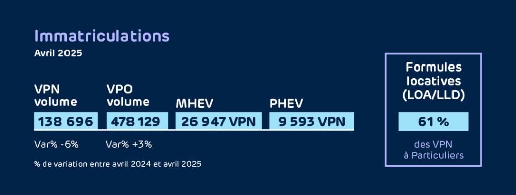 Au total, il en résulte un volume d’immatriculations de 138 696 VPN, en baisse de -6 % en avril 2025 versus avril 2024 (à nombre identique de jours ouvrés).