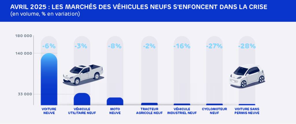 Les marchés des véhicules n’ont pu réitérer la bonne performance d’avril 2024. En effet, ce mois passé, les marchés des véhicules neufs s’enfoncent dans la crise. Cette dernière a commencé dès février 2025 et ne montre pas encore de signes positifs. Les marchés d’occasion profitent quelque peu des reports des acheteurs.