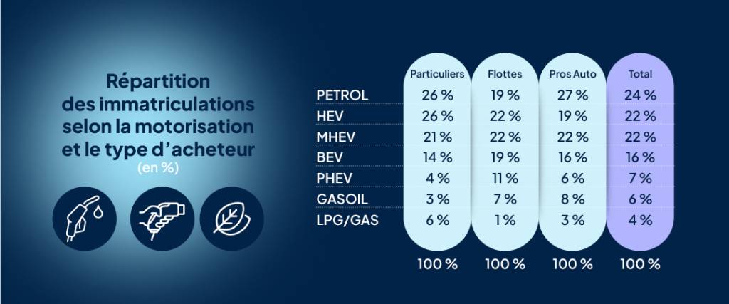 Les ventes de voitures thermiques continuent de reculer (diesel - 5 % et l’essence – 3 %, mais à eux deux assurent 85 % des transactions), tandis que les motorisations électrifiées sont toutes en forte progression (notamment +40 % pour les HEV, + 23 % pour les électriques).