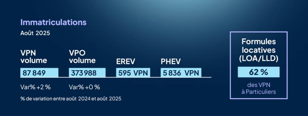 La vigueur des immatriculations de voitures neuves électriques en août repose surtout sur la demande des flottes. Leur soutien à cette motorisation ne faiblit pas, puisqu’elle atteint une part de 24 % sur ce canal, avec un bond de +57 %. Chez les particuliers, leur part atteint 19 % en août, mais les ventes ne remontent pas avec -1 % versus août 2024.