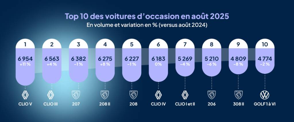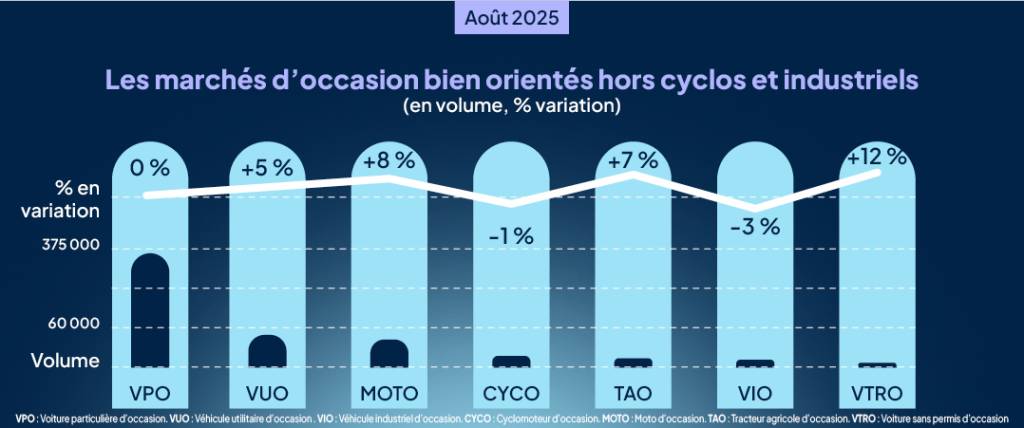 En retrait les deux mois précédents, le marché des voitures d’occasion (VO) totalise 373 988 transactions en août et reste stable. Toujours soutenu par les VO les plus anciens de plus de 10 ans (+7 %), il souffre en revanche du manque de modèles récents de moins de 5 ans (-8 %).