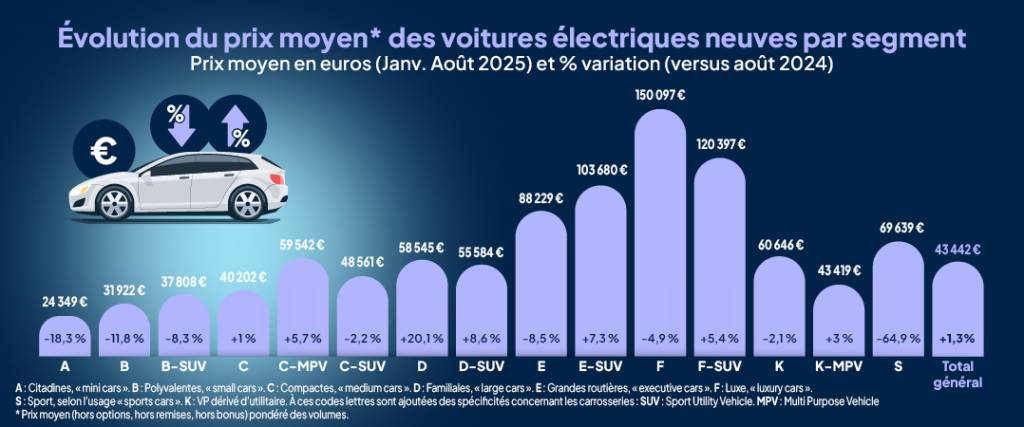 Cet étoffement de l’offre s’accompagne d’une évolution des prix neufs moyens (hors options, remises et avant bonus), avec une hausse de 1,3 % observée sur l’ensemble du marché entre janvier et août 2025. Toutefois, cette tendance générale masque des disparités marquées entre les différents segments.